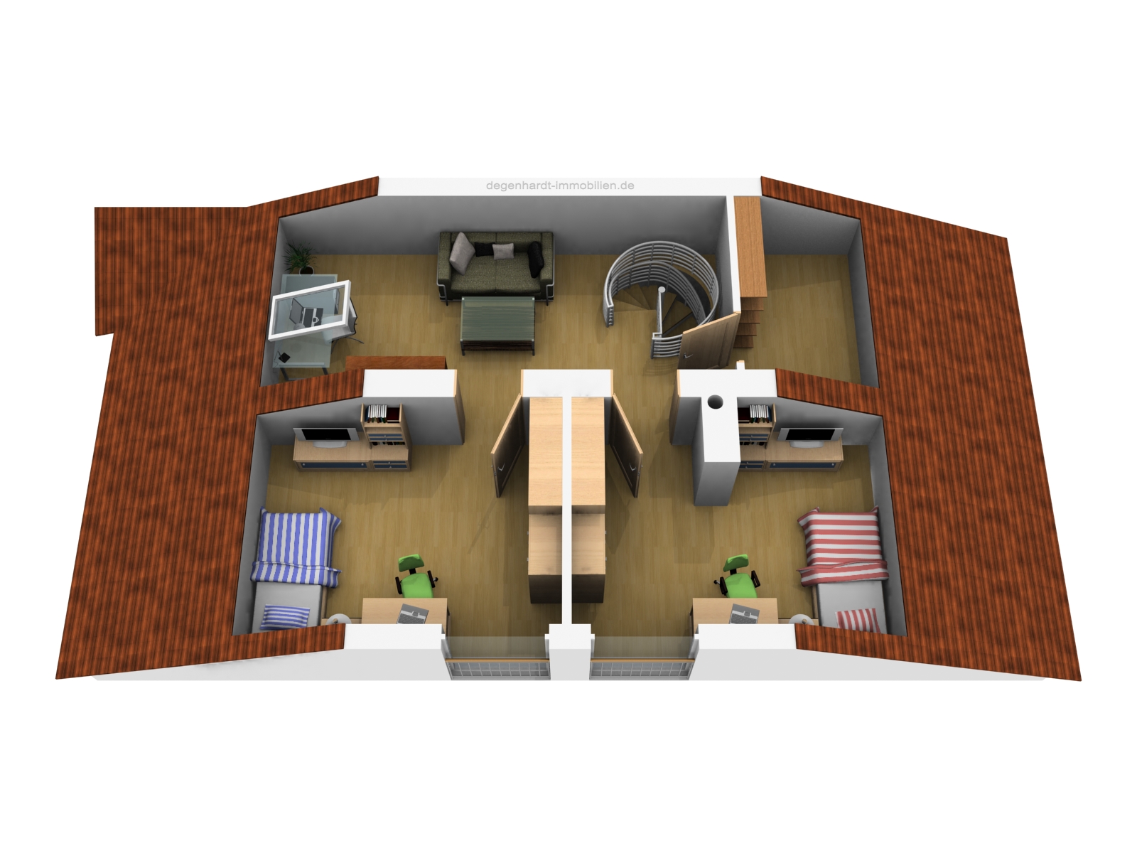 Neben dem großen, hellen Wohn-, Essbereich mit angrenzender Küche stehen Ihnen im Obergeschoss ein großes Bad mit Badewanne, Waschbecken, WC und Handtuchheizkörper, sowie ein Schlafzimmer zur Verfügung. Das Wohnzimmer bietet den Zugang zum Südwestbalkon, von dem aus Sie die Mittags- und Abendsonne genießen können. Über eine Wendeltreppe erreichen sie das Dachgeschoss mit einem als Arbeitsbereich geeignetem Vorraum und zwei gleich großen Studiozimmern sowie einen praktischen Abstellraum.