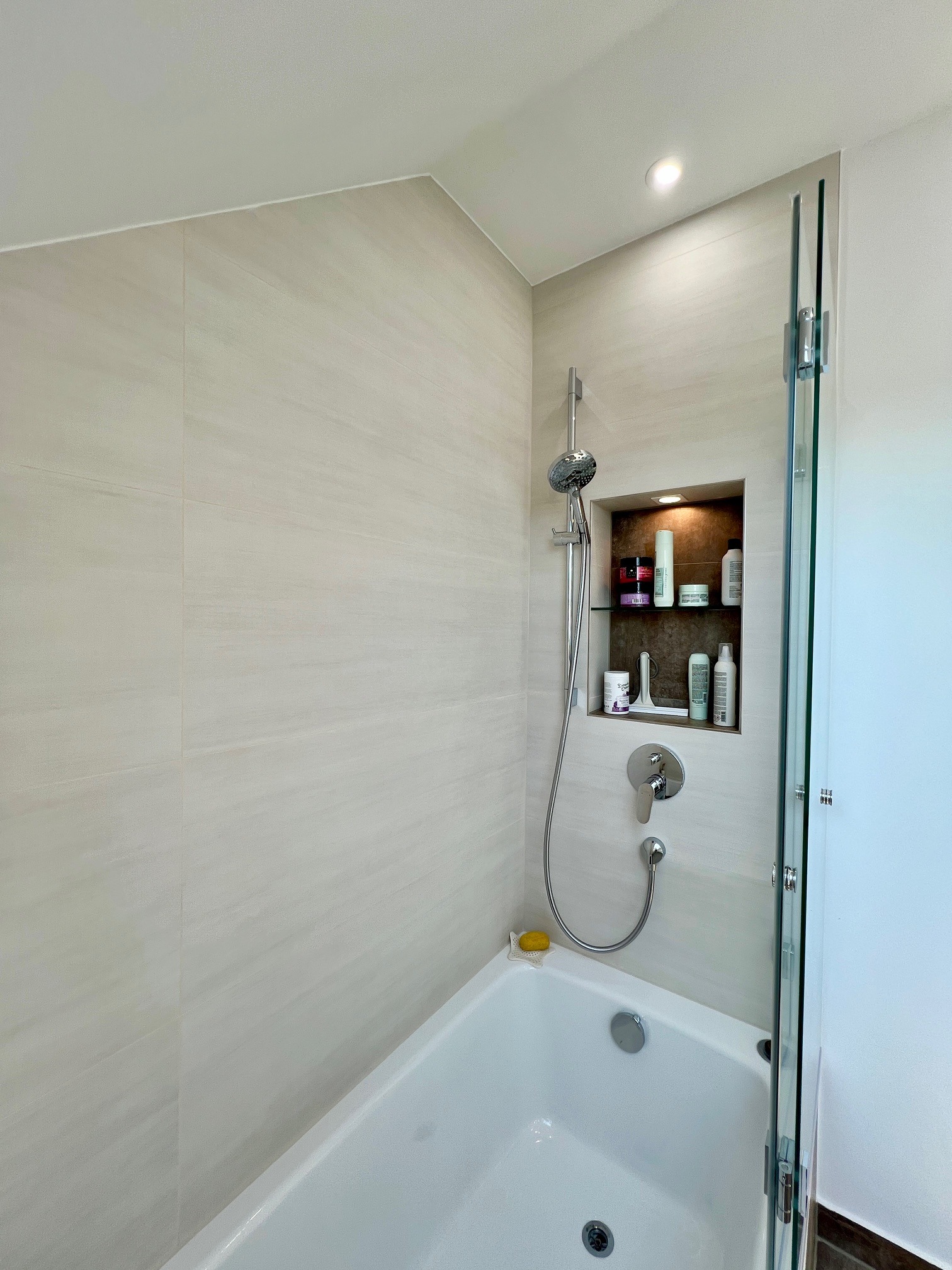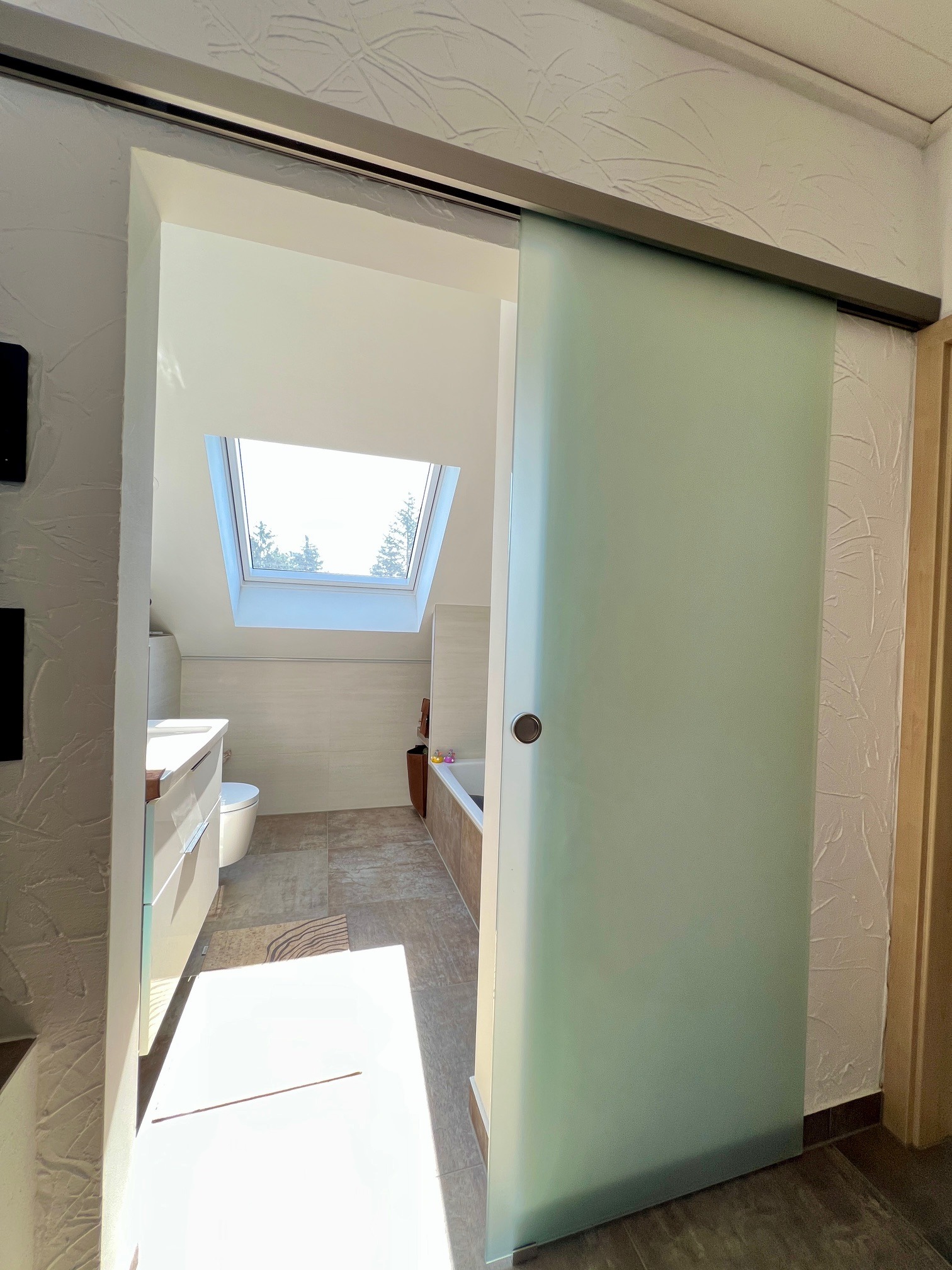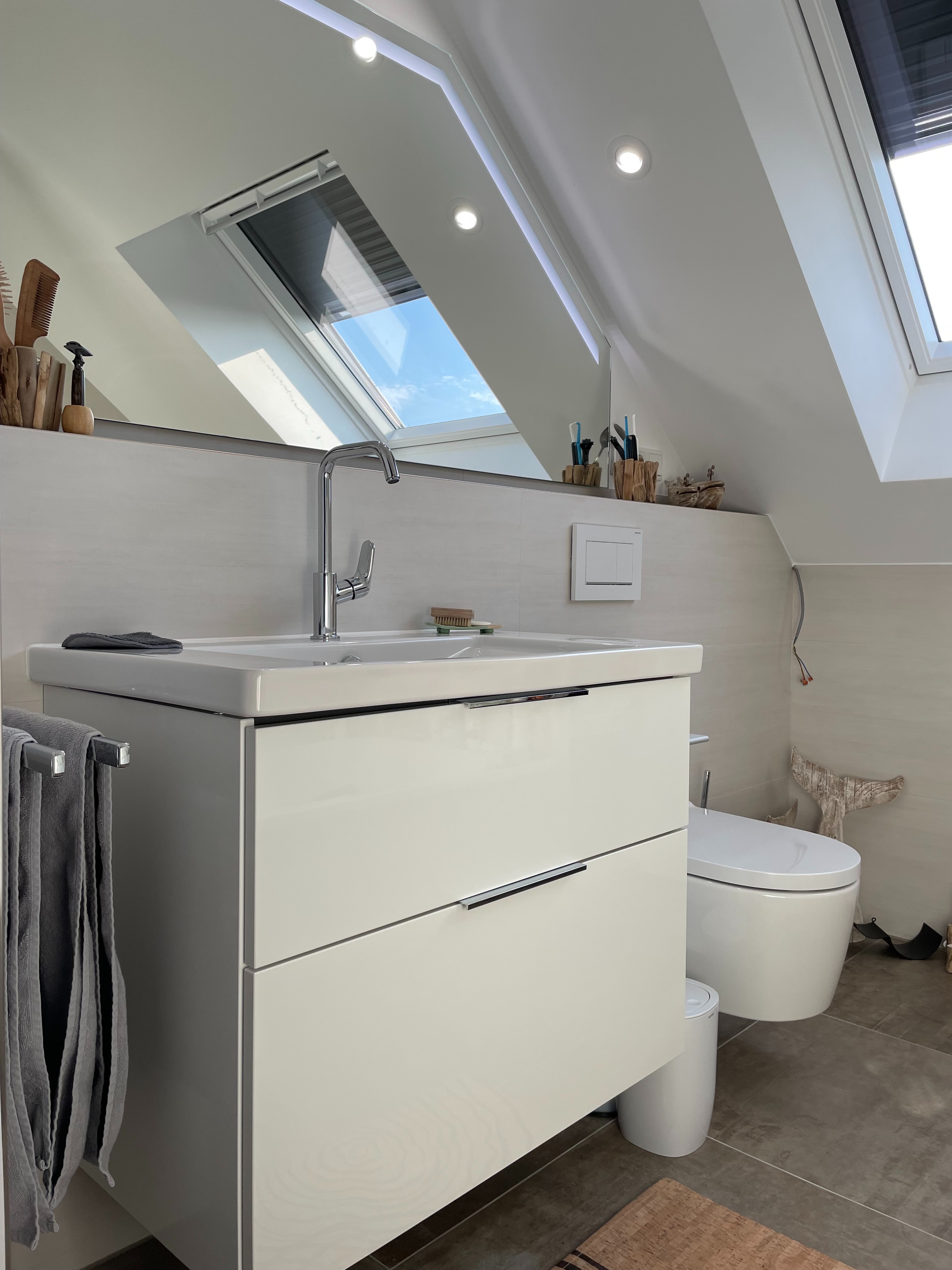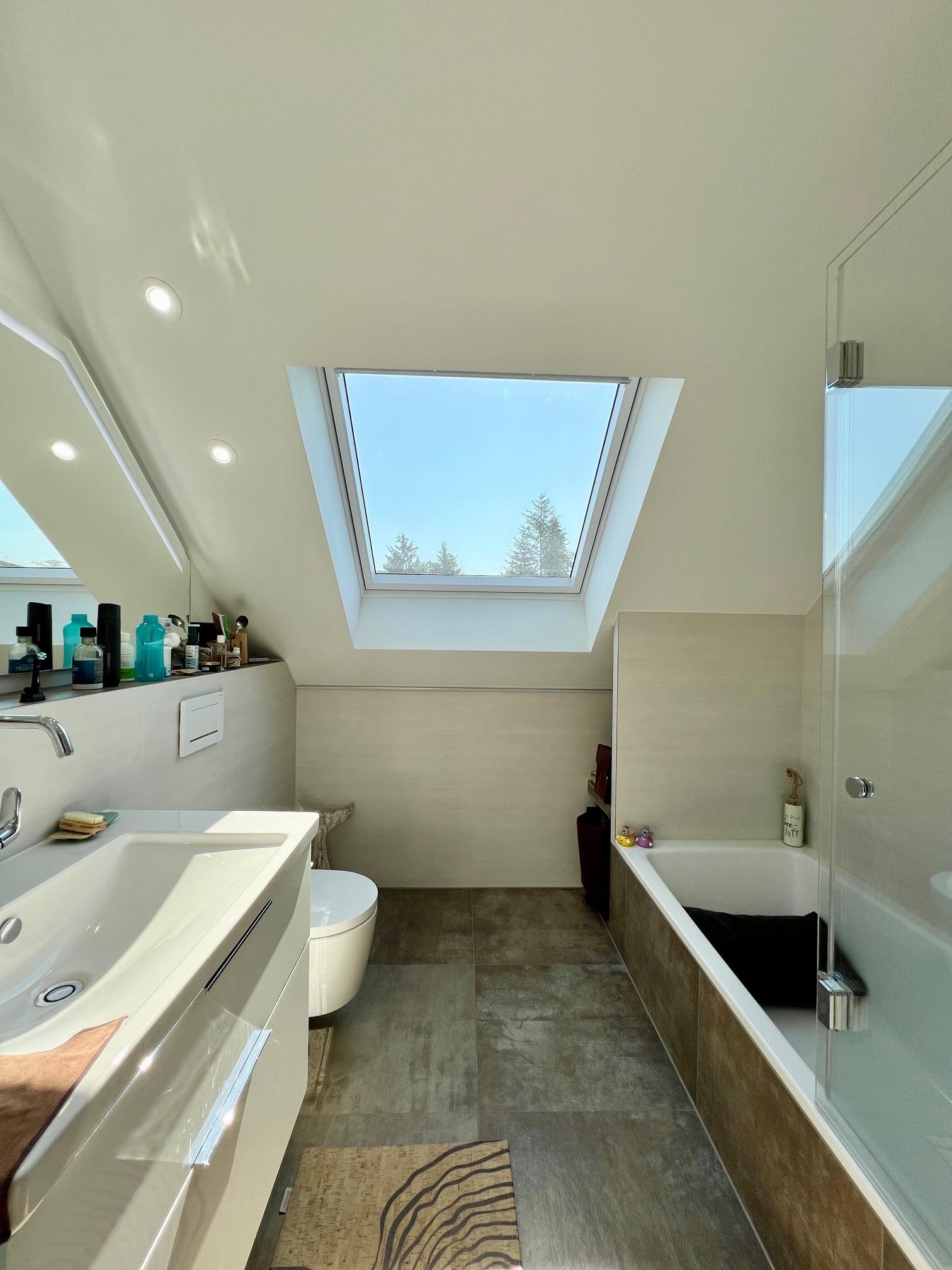 - Neues Badezimmer mit Badewanne, Waschtisch, WC mit Bidet-Funktion, Dachflächenfenster mit fernbedienbarer Außenjalousie, Integrierte LED-Leuchten, großformatige Feinsteinfließen