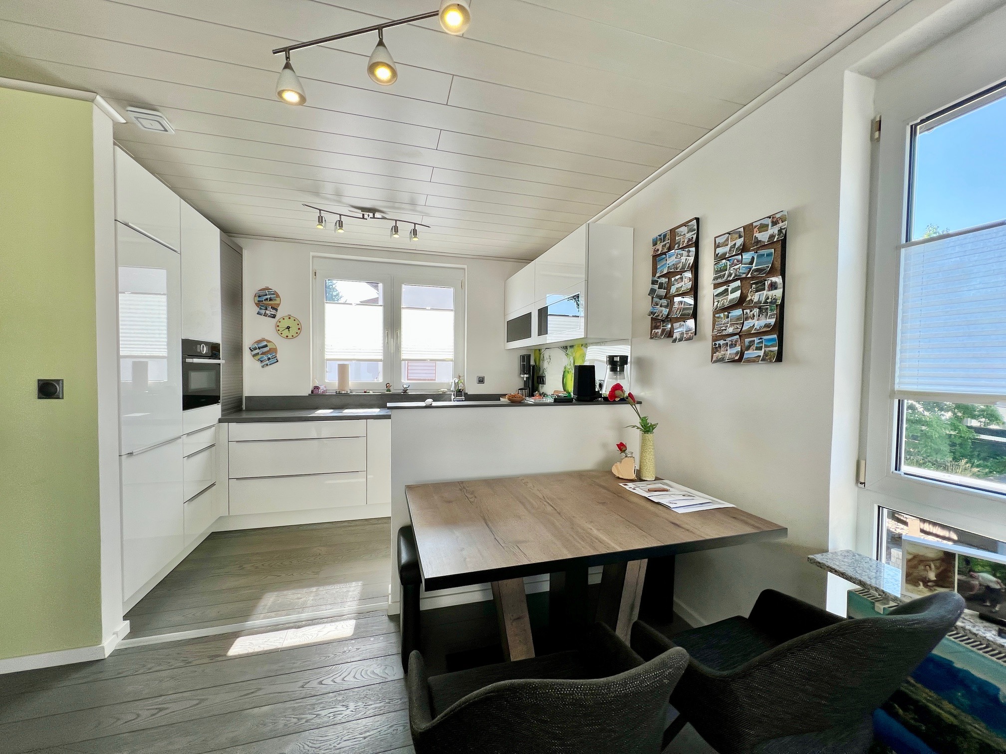 Neben dem großen, hellen Wohn-, Essbereich mit offener Küche stehen Ihnen im Obergeschoss ein praktischer Abstellraum, ein Gäste WC mit vorbereiteter Dusche (derzeit mit Infrarotkabine) sowie ein Arbeits- oder Gästezimmer zur Verfügung. Das Wohnzimmer bietet den Zugang zum Südwestbalkon, von dem aus Sie die Mittags- und Abendsonne genießen können. Eine hochwertige, moderne Einbauküche ist im Kaufpreis enthalten. Über eine massive Treppe erreichen sie das Dachgeschoss mit 2 großzügigen Studiozimmern das Bad. Das helle, komplett modernisierte Tageslichtbad ist mit großformatigen Feinsteinfliesen, integrierten LED-Leuchten (RGB- Farbwechsel), einer Badewanne sowie einem Waschtischschrank ausgestattet und verfügt zudem über ein fernbedienbares Dachflächenfenster mit elektrischer Außenjalousie. Ein weiteres Highlight ist sicherlich die geschützte Dachloggia mit Südwestausrichtung zum Relaxen.