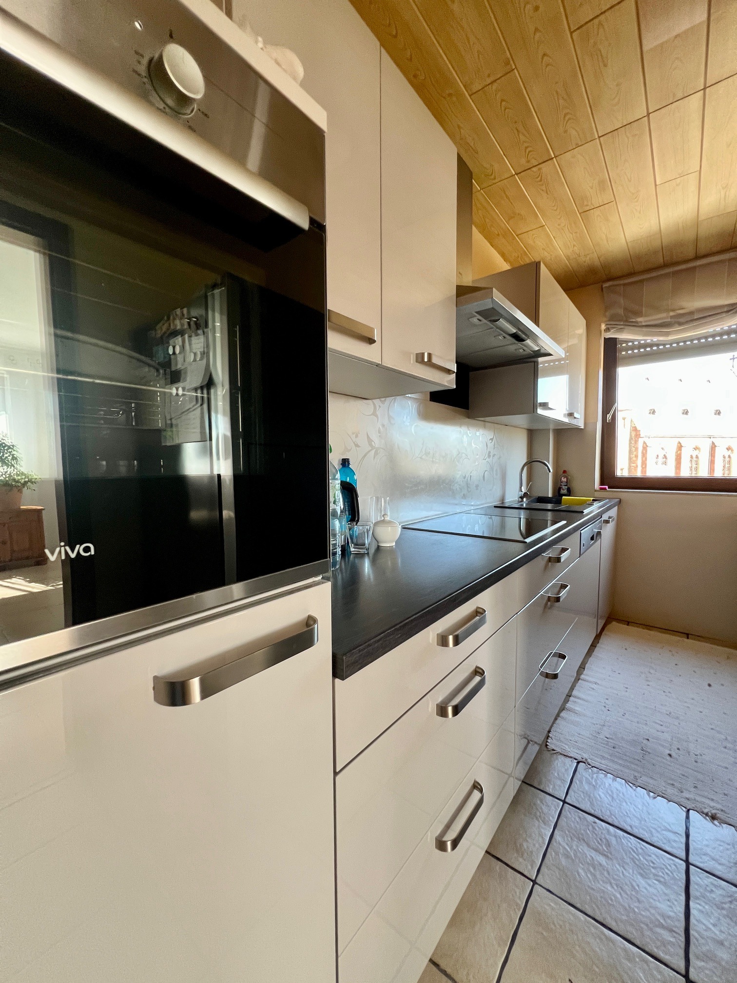 Die an das Wohnzimmer anschließende Küche ist voll eingerichtet. Die Einbauküche ist bereits im Kaufpreis inklusive aller Elektrogeräte und einem Side-by-Side-Kühlschrank enthalten.