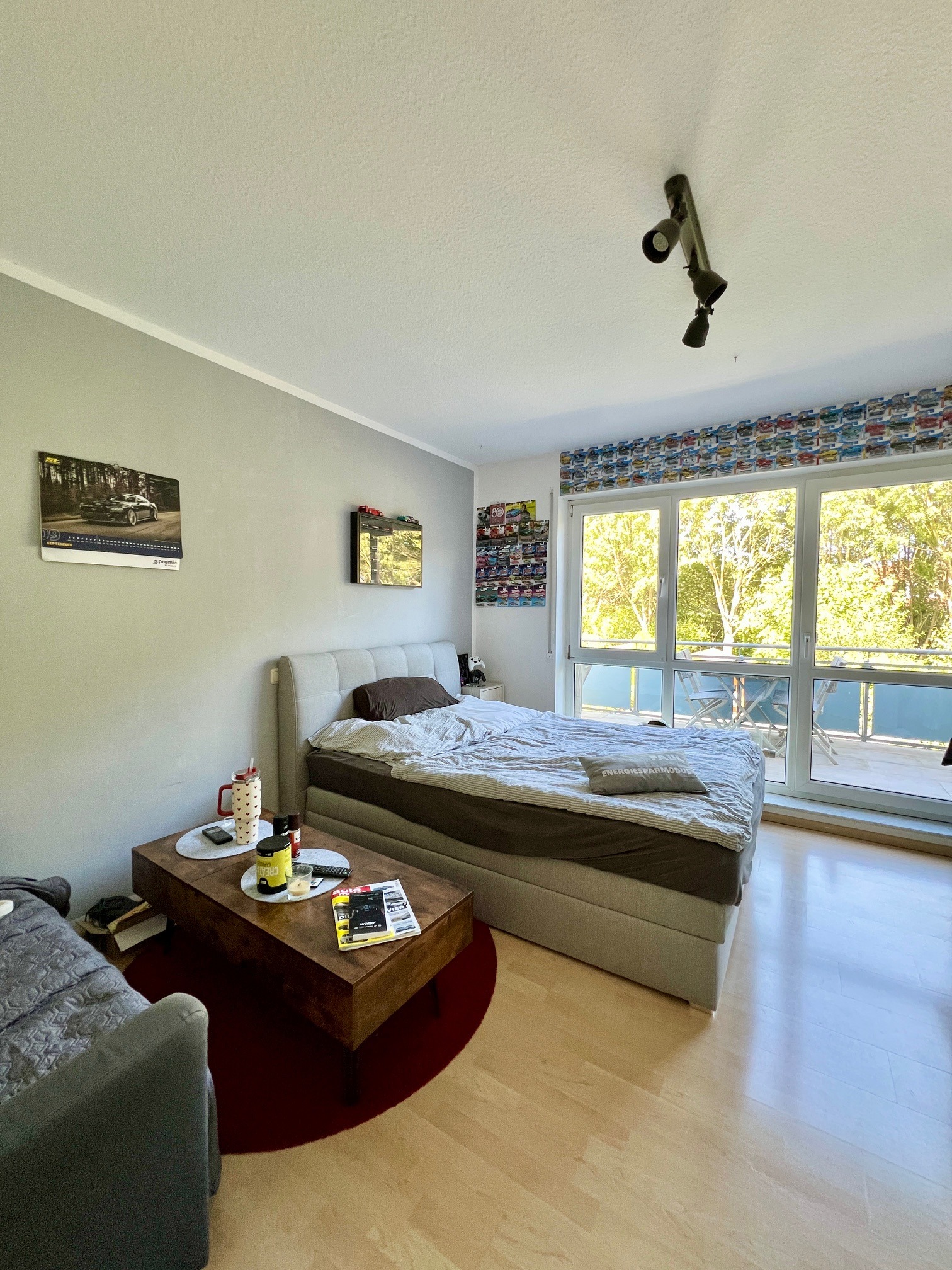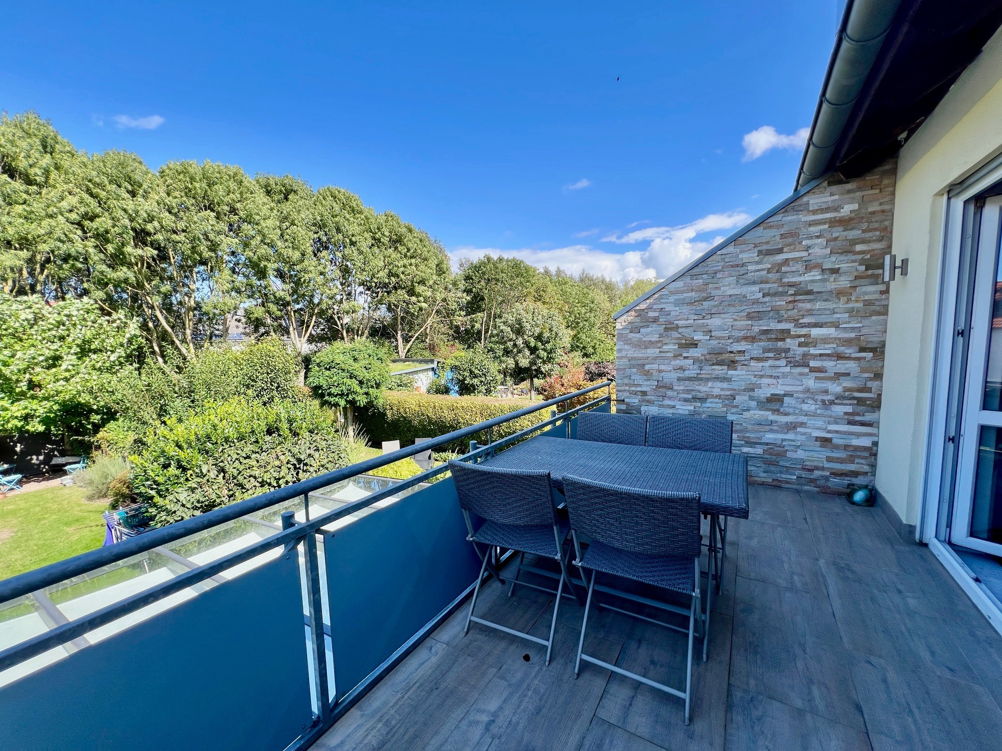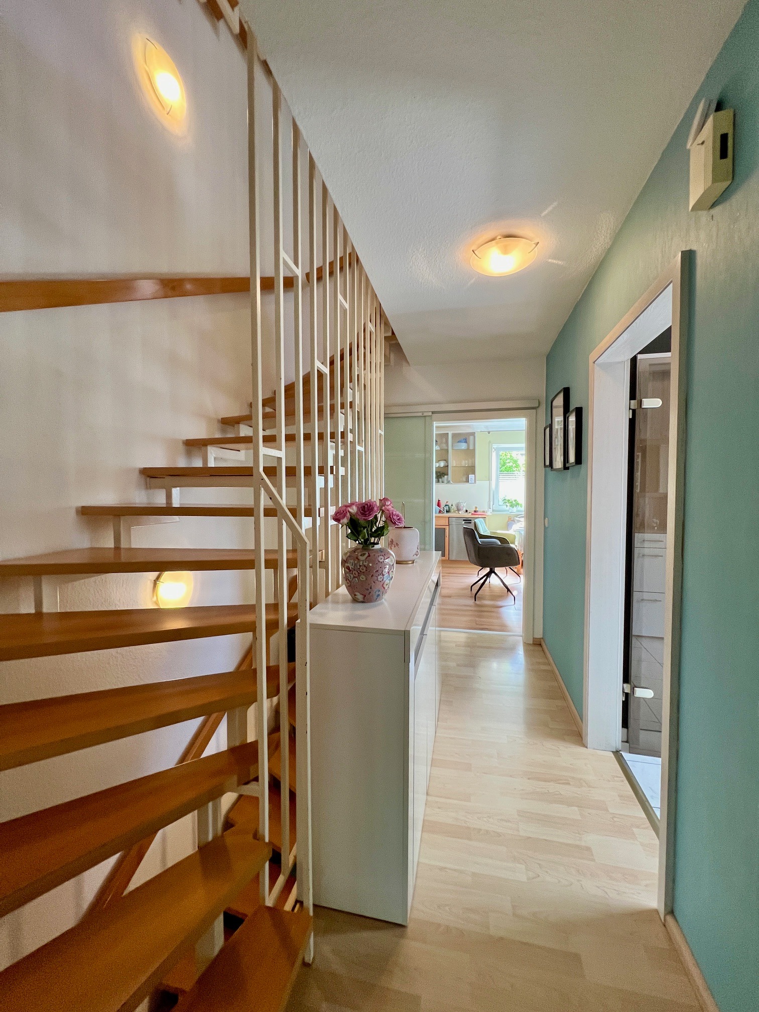 Über das offene Treppenhaus gelangt man in das Obergeschoss, das zwei Schlafzimmer (eines davon mit begehbarem Kleiderschrank), ein modernisiertes Badezimmer sowie einen großzügigen Balkon zur Gartenseite für Sie bereithält.