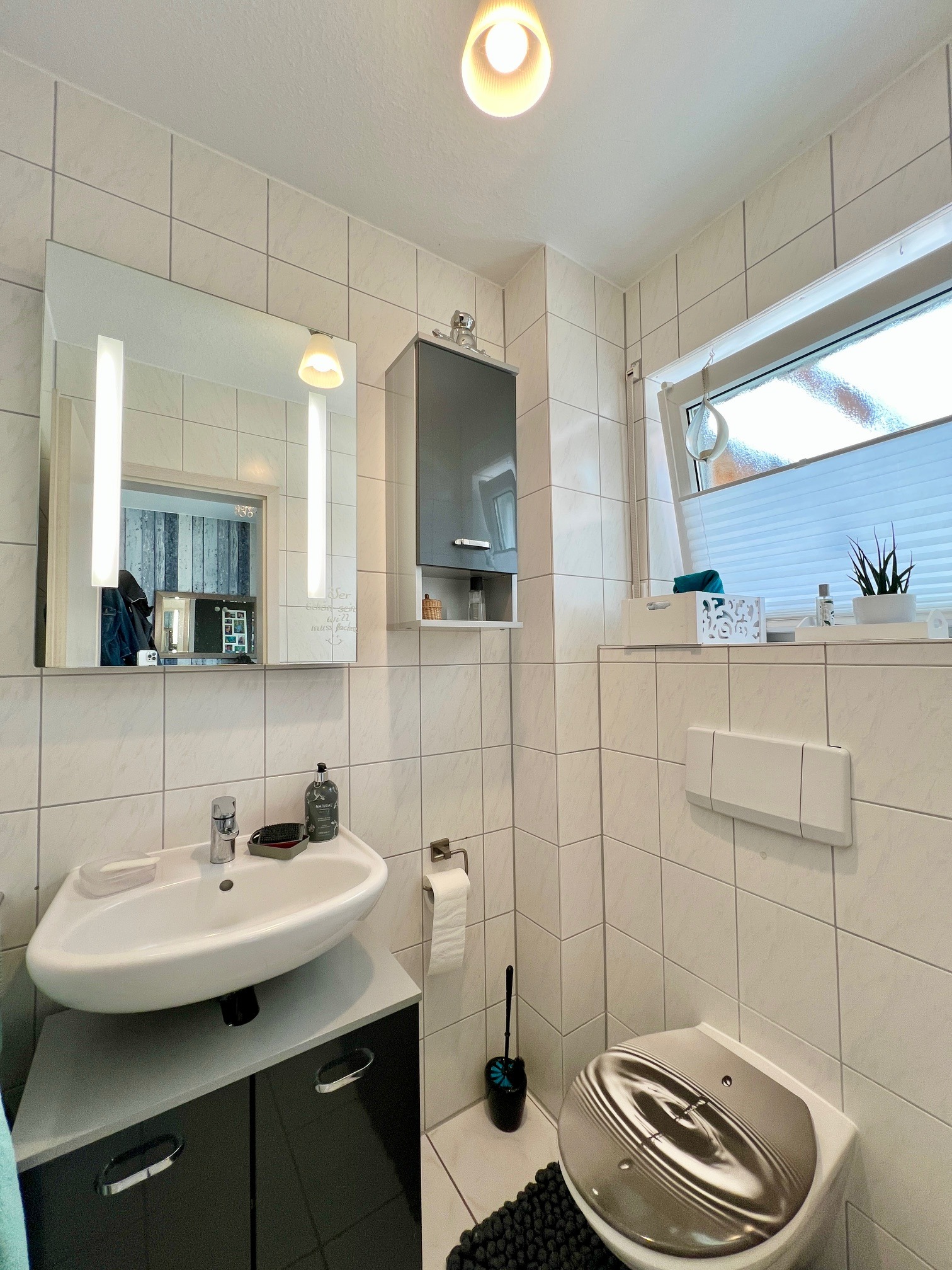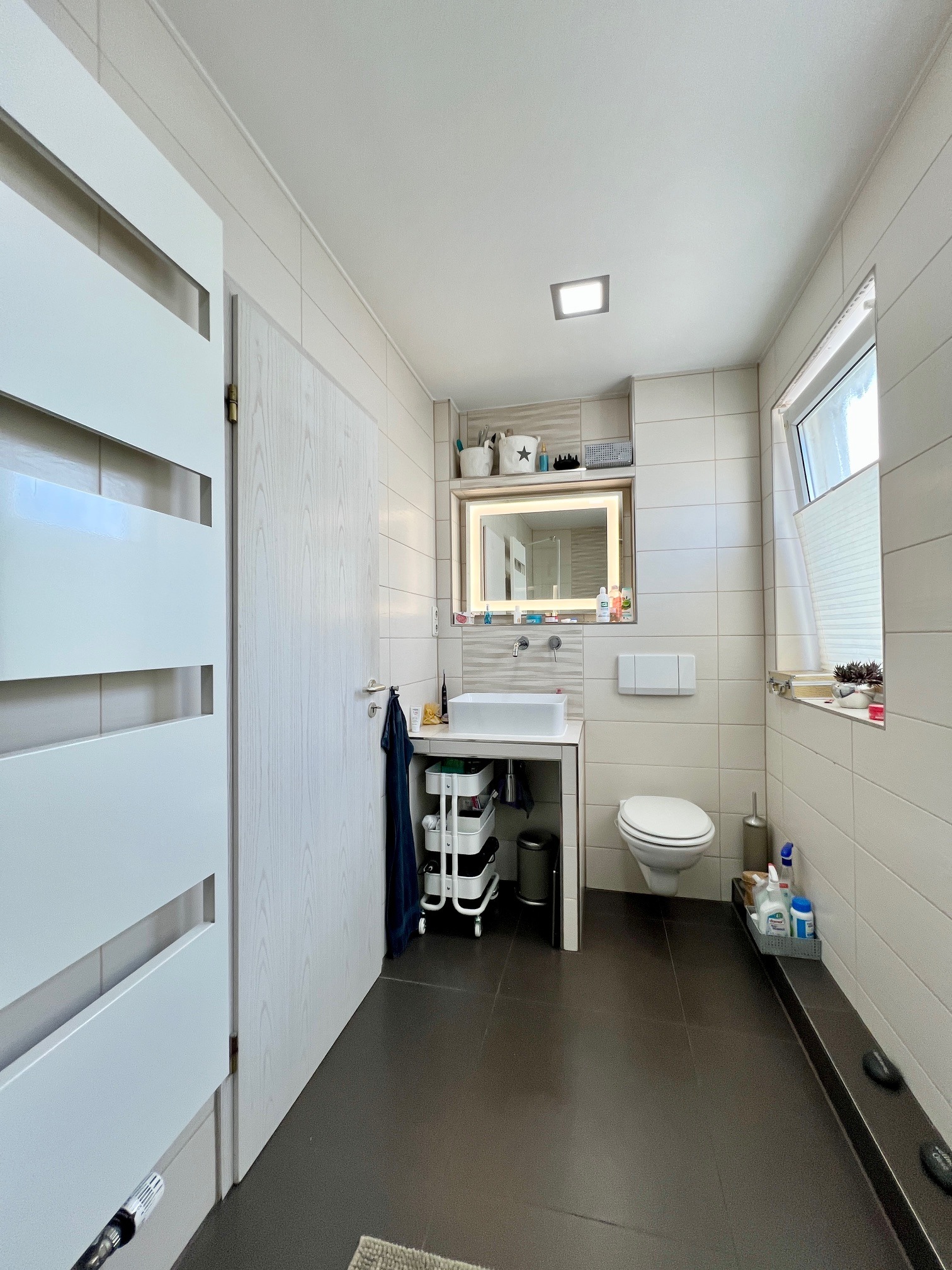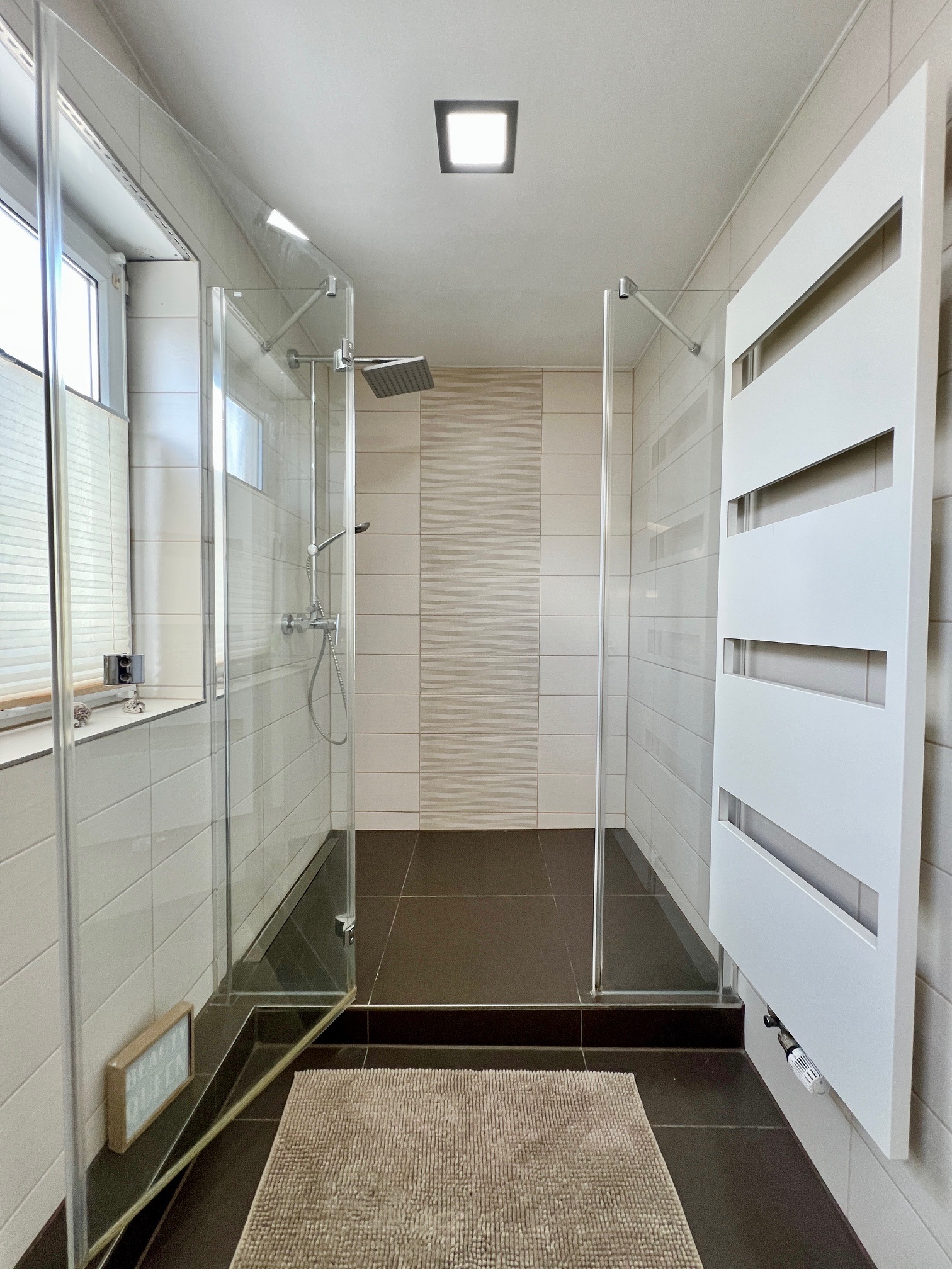 - neuwertiges Duschbad (Waschtisch, WC, große Dusche mit Feinsteinfliesen im Großformat, Fenster, etc.)
