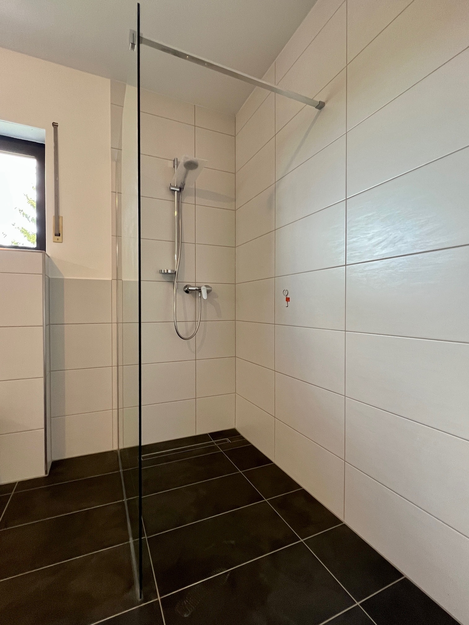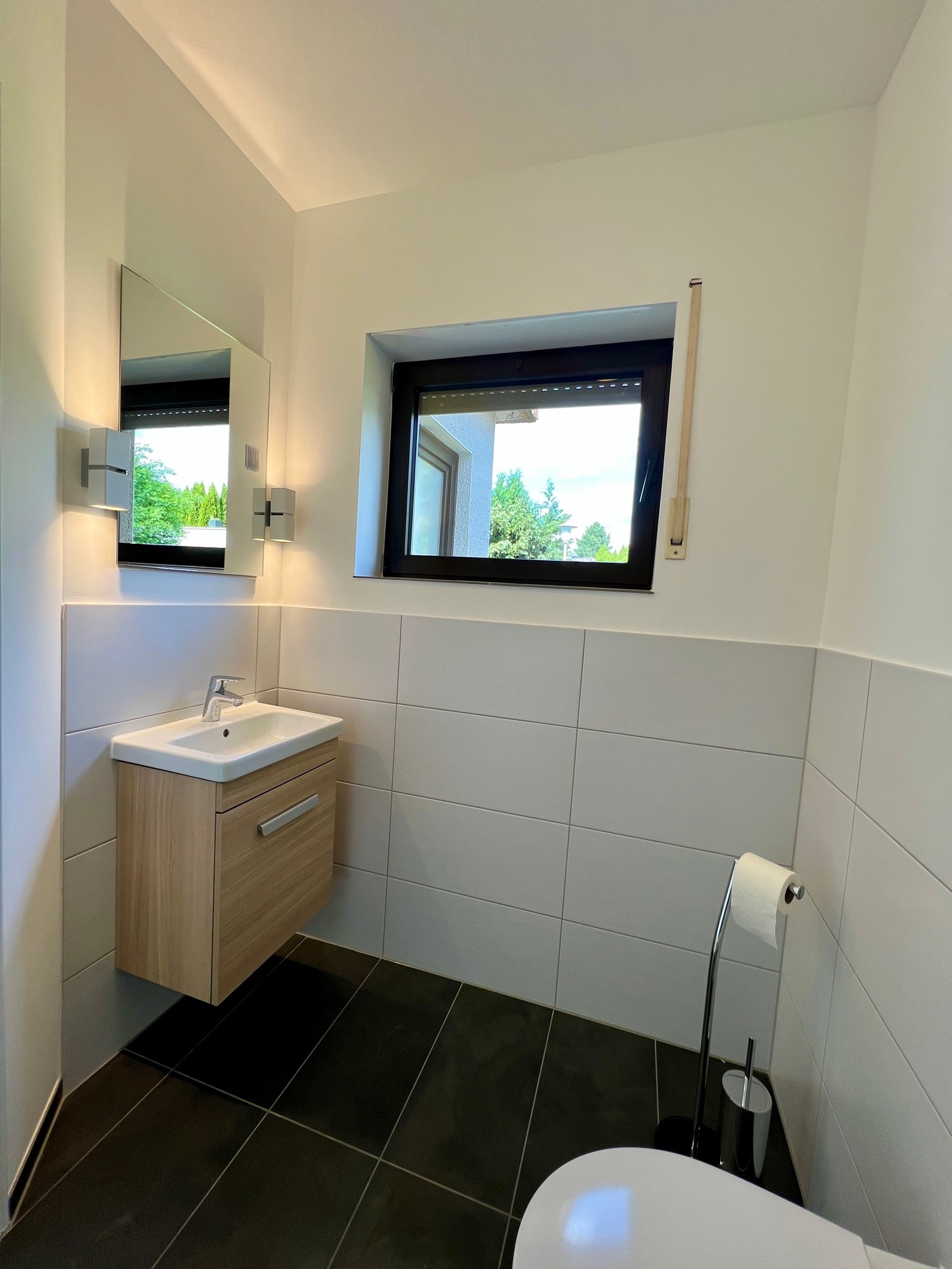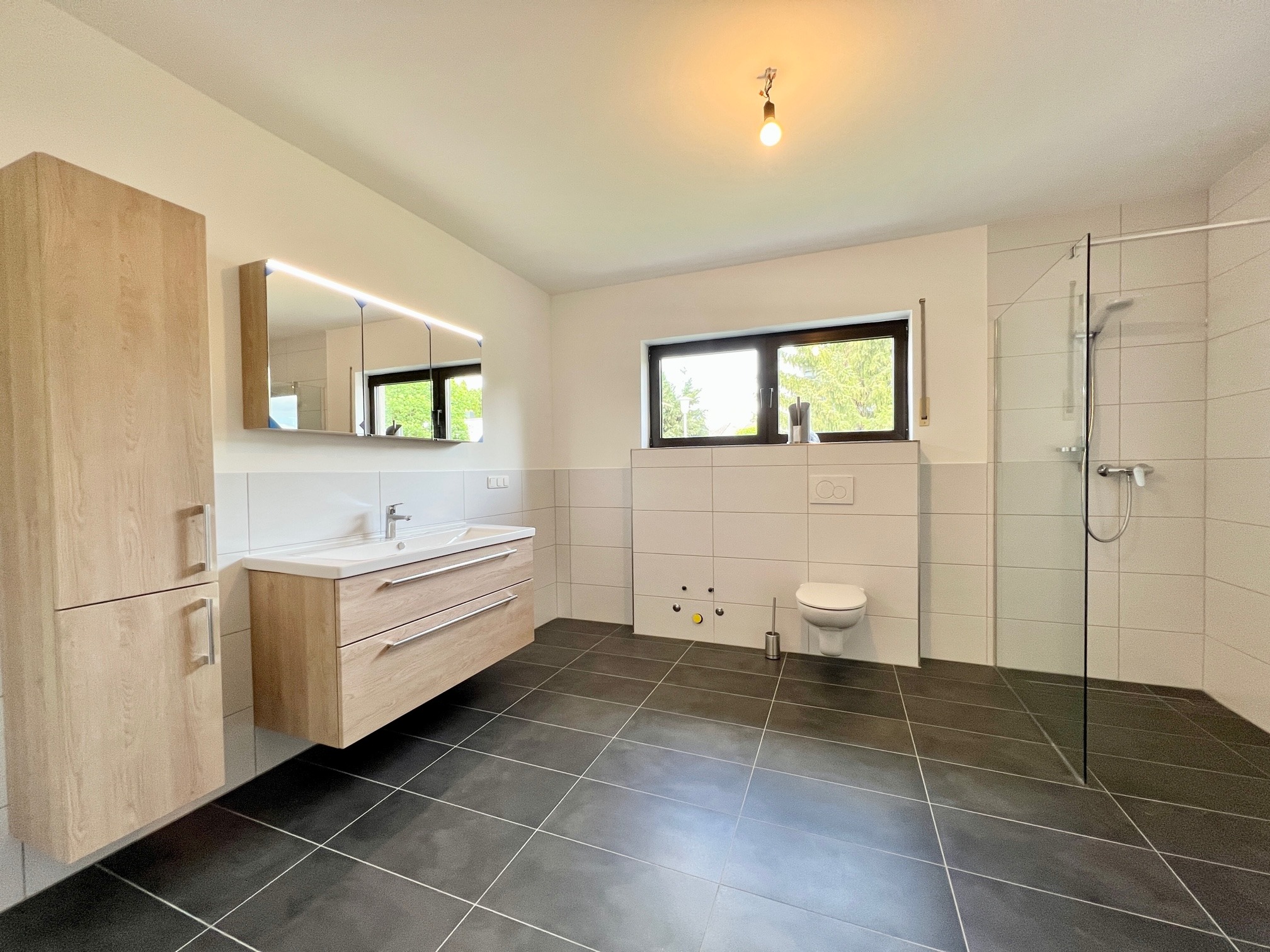 - Neues Badezimmer mit bodengleicher Dusche, Waschtisch mit Schränken, Spiegelschrank mit LED-Beleuchtung, WC und Waschmaschinenplatz